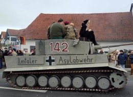 UPDATE: Inzwischen ermitteln die Behörden wegen des Verdachts der Volksverhetzung im Fall des Panzers. Auf der Seite des Vereins OCV Steinkirchen, der den Umzug organisiert hatte, hagelte es scharfe Kritik. Der Verein betonte, es gebe keine rechtsradikalen Tendenzen unter den Mitgliedern. Auch Flüchtlinge seien integriert worden und beim Umzug mitgelaufen. Weiter wollte sich zunächst niemand zu dem Vorfall äußern. Der Verein kündigte eine offizielle Stellungnahme an.